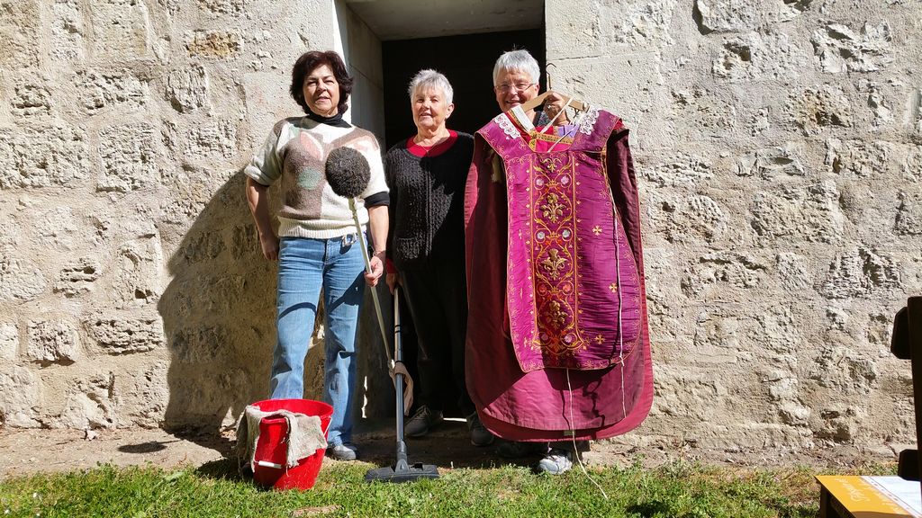 Pour faire suite au grand nettoyage de printemps de l’Église St Germain, Martine, Françoise et Francine se sont réunies à nouveau pour mettre de l’ordre dans la sacristie. Les meubles ont été cirés et les aubes et chasubles ont été brossées avant de retrouver la place qu’elles occupent depuis de nombreuses années.
