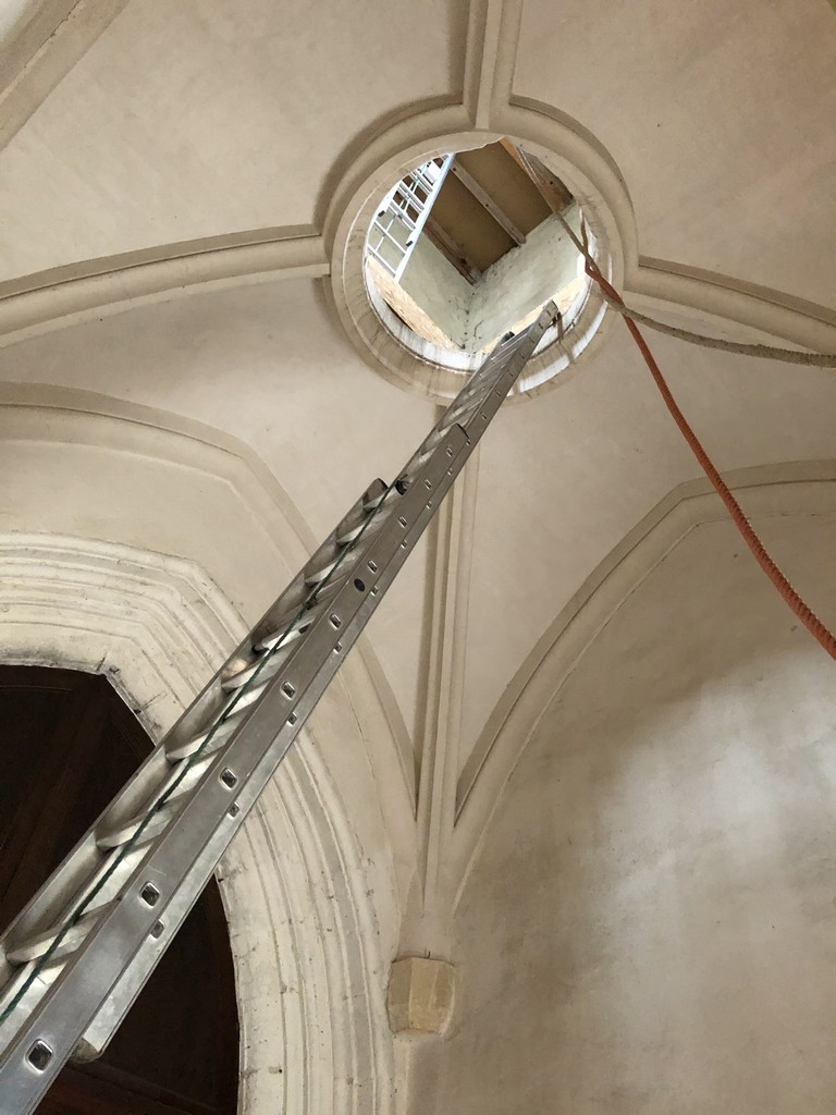 Ces travaux ont permis la pose d’un plancher en sapin sur les poutres de bases du beffroi afin de procéder à l’entretien des cloches en toute sécurité.