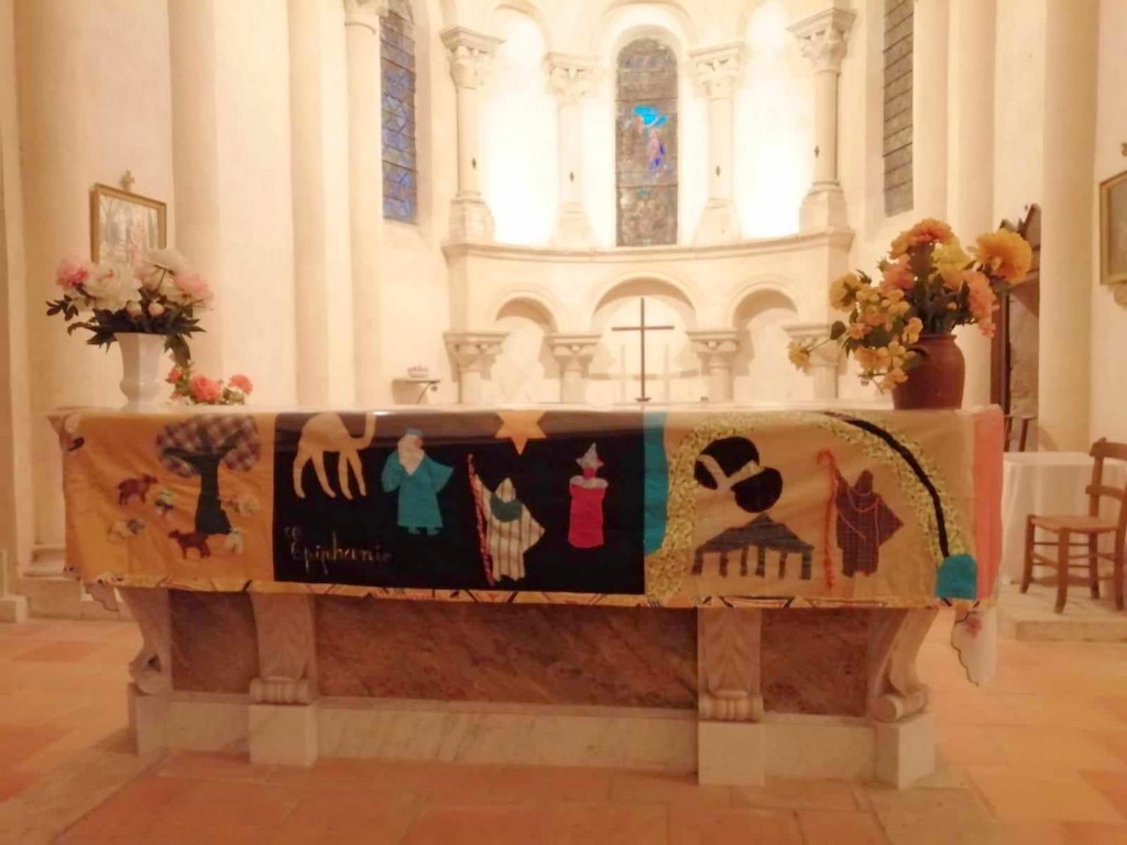 Comme chaque année, Martine et Agnès se sont retrouvées à l’Église St Germain de La Sauvetat du Dropt pour monter la crèche de Noël. Confectionnée avec des matériaux recyclés, cette crèche est unique et orne le devant de l’autel. Sur l’autel, un patchwork bande dessinée de Madame Constant, autrefois fait par ses élèves de catéchisme, représente plusieurs scènes de la Nativité.