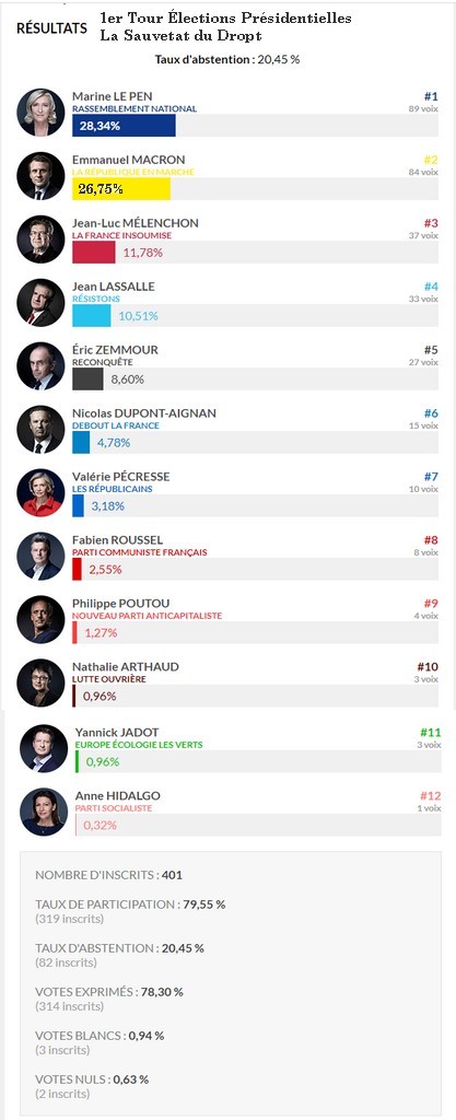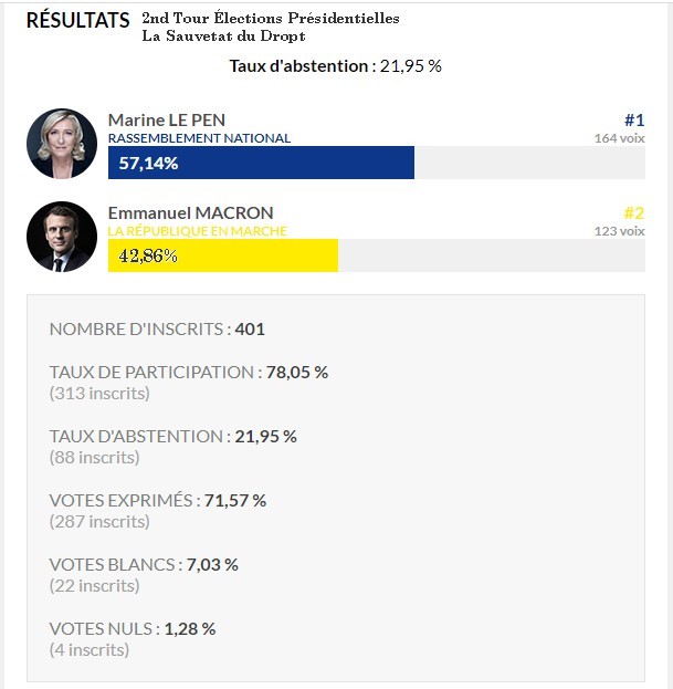 Résultats des Élections Présidentielles pour le village de La Sauvetat du Dropt donnés sur le journal Sud-Ouest Lot-et-Garonne du dimanche 24 avril 2022.
