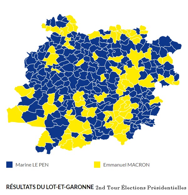 Mme LE PEN avait déjà reçu un score plus élevé au terme du premier tour de Lot-et-Garonne avec 27,32 % des votes, quand M. MACRON en avait reçu 23,12 %. La candidate Rassemblement national réussit donc à maintenir sa position bien que son concurrent En Marche ! ait profité d’un meilleur report de voix : la première bénéficie du report de 32 584 suffrages, tandis que le deuxième en récolte 38 777 supplémentaires.