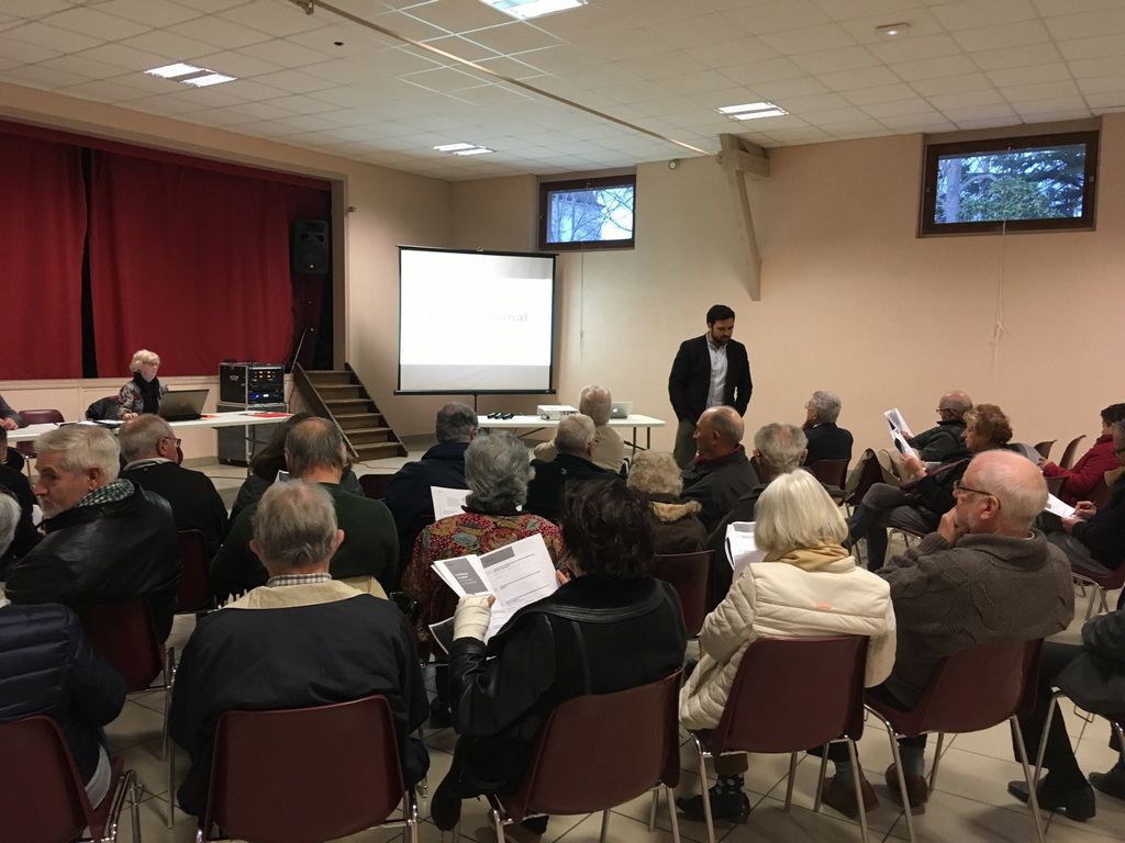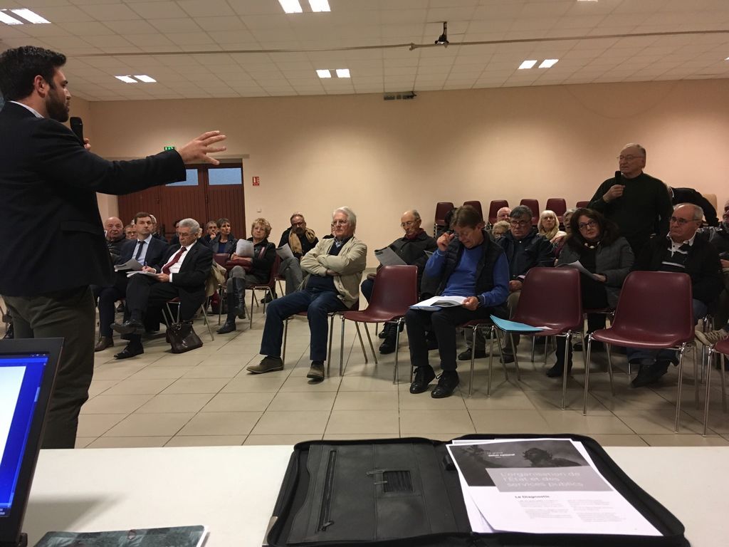 Emilien poursuit en détaillant la compétition. Les entraînements qui lui ont fait retrouver une forme olympique qu’il croyait perdue apparemment (sourire dans l’assistance) et les épreuves du championnat mondial au nombre de 3, une descente, un slalom et un cross.