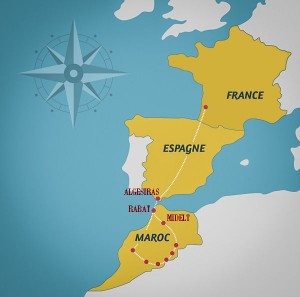 Benjamin et Timothy reprennent la route depuis Marrakech dimanche 28 à 7h, puis le bateau à 18h et débarquent 2h plus tard en Espagne. Ils auront roulé toute la journée et une partie de la nuit de lundi à mardi pour arriver à La Sauvetat à 2h du matin dans un bruit d’enfer puisque pas de pot d’échappement.