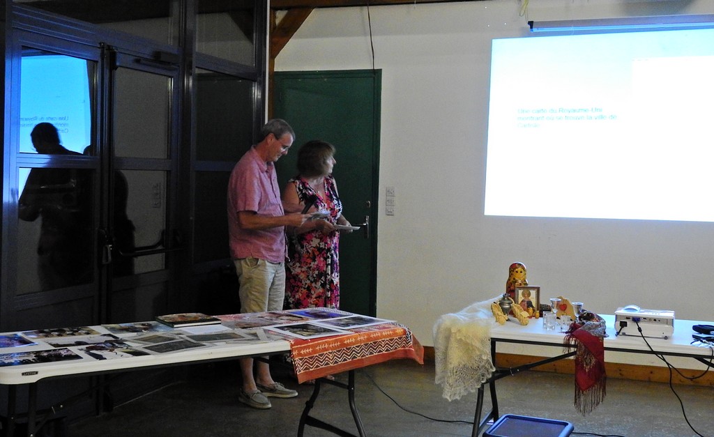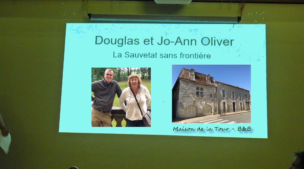La soirée se terminait par un retour au Royaume-Uni avec le couple formé de Jo-Ann et Doug. Né en Écosse où il résidait jusqu’à l’âge de 17 ans avant de s’engager dans la Marine Royale, Doug rencontrait Jo-Ann en Angleterre. Ils ont déménagé plusieurs fois de la Cornouaille plus au centre du pays et montrait de belles photos de campagne vallonée et verdoyante ainsi qu’une ruine de château magnifique. C’est avec le désir de vivre en France au sein d’une communauté sans être isolés à la campagne qu’ils posaient leurs valises dans le village de La Sauvetat, dans la belle maison renaissance de l’Avenue de Grammont où ils accueillent des touristes dans leurs magnifiques chambres d’hôtes de la Maison de la Tour.