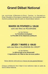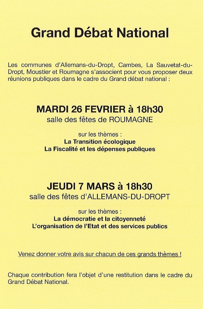 Organisé par les communes de Allemans du Dropt, La Sauvetat du Dropt, Roumagne, Moustier et Cambes, le Grand Débat eut lieu le jeudi 26 février à Roumagne puis le jeudi 7 mars à Allemans du Dropt.