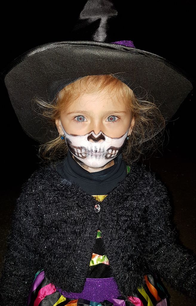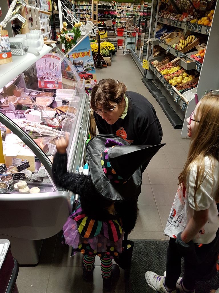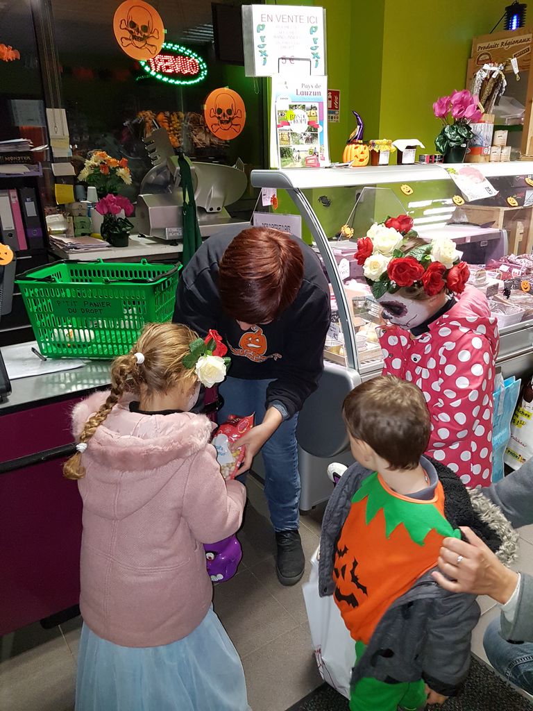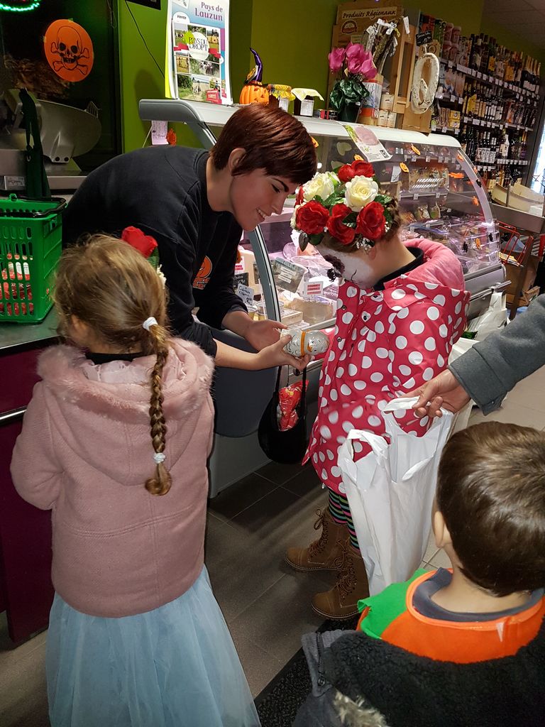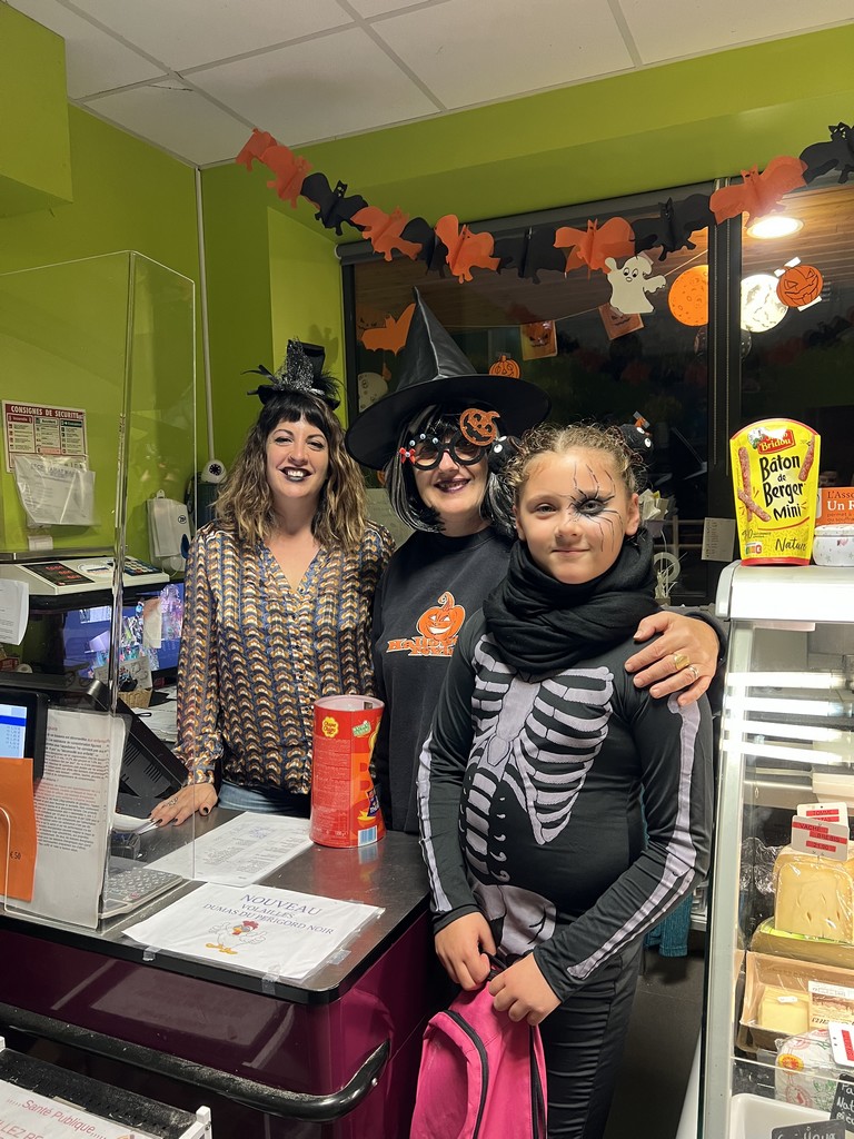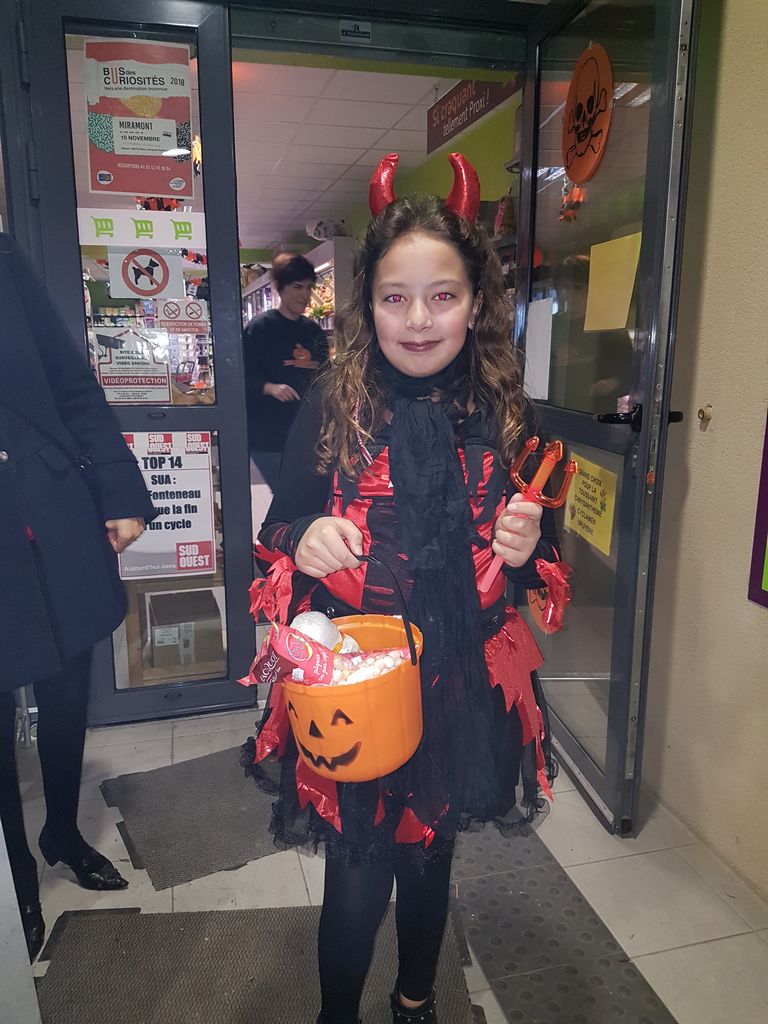 Comme chaque année à l’occasion d’Halloween, c’est elle qui maquille sa fille avant d’aller faire le tour du village pour frapper aux portes et ramener des bonbons. Après être passée chez sa plus proche voisine, Victoire était reçue à bras ouverts au Cocci P’tit Panier du Dropt par deux charmantes hôtesses, elles aussi déguisées.