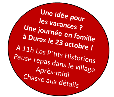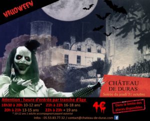 Halloween Jeudi 31 octobre Avec la participation du Théâtre de l’Atelier de MarmandeTremblez !! Halloween revient au Château de Duras. Rendez-vous le soir du jeudi 31 octobre pour une visite très spéciale…
