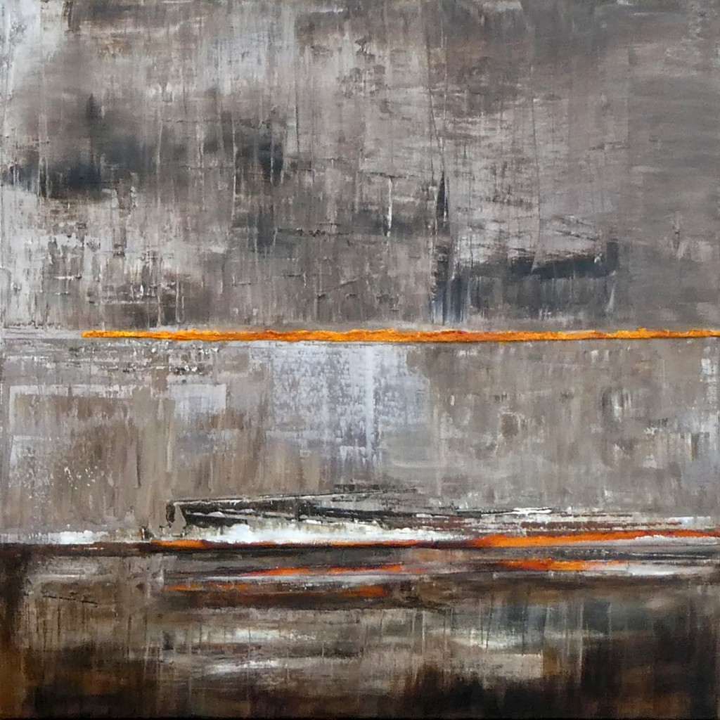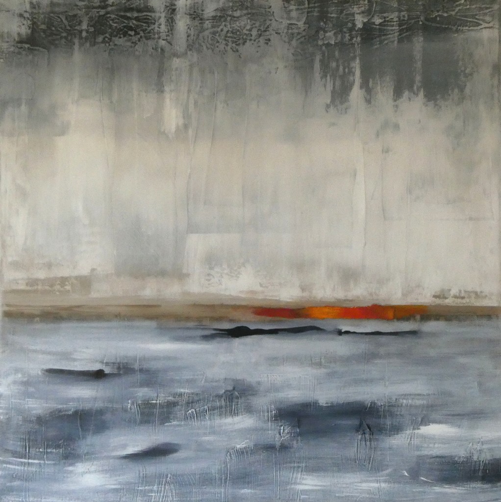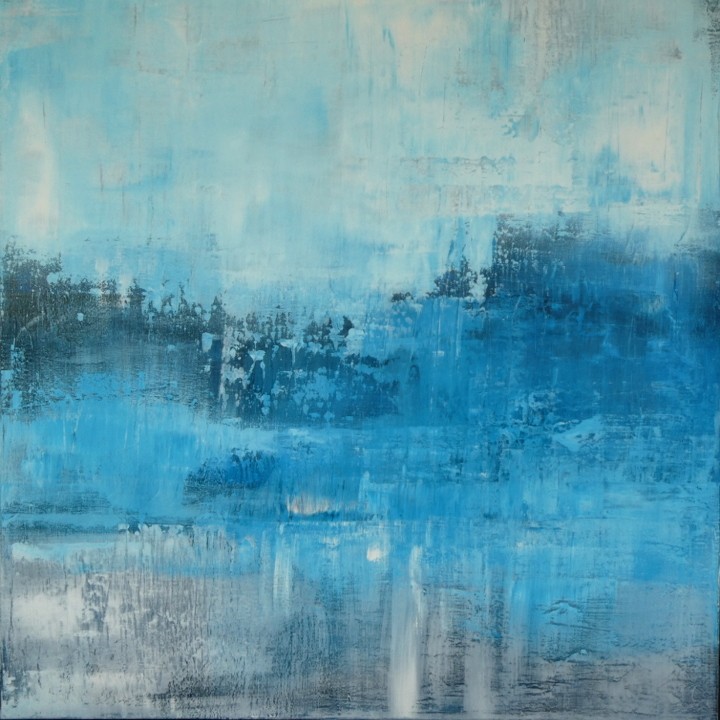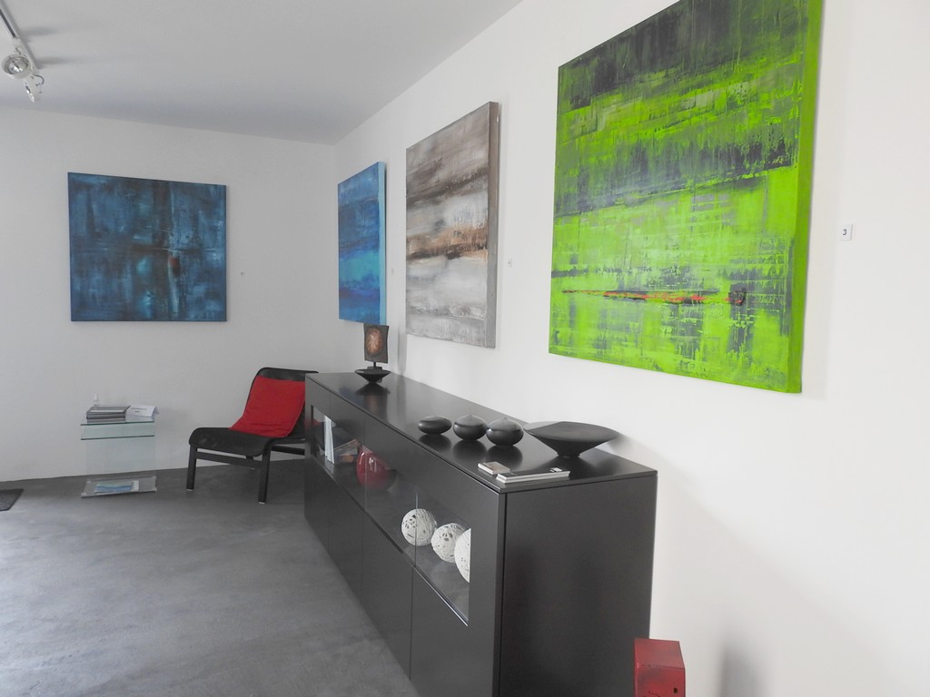 Nous entrons dans sa maison par l’entrée où sont accrochées de grandes toiles, là aussi, colorées. Sur la plupart des tableaux, une couleur domine et se décline en nuances subtiles. Des gris infinis, des bleus turquoise, des verts prairies de printemps … le style est abstrait bien que l’on y devine de vastes paysages ou des étendues d’eau aux reflets changeant, aux mouvements menaçants, surplombées de ciels chargés au travers desquels percent des rayons de lumière. Le fil conducteur en est toujours une ligne horizontale posée sur le premier tiers de l’œuvre et aussi, souvent, une touche de rouge flamboyant qui rappelle l’œil malicieux et pétillant du peintre.