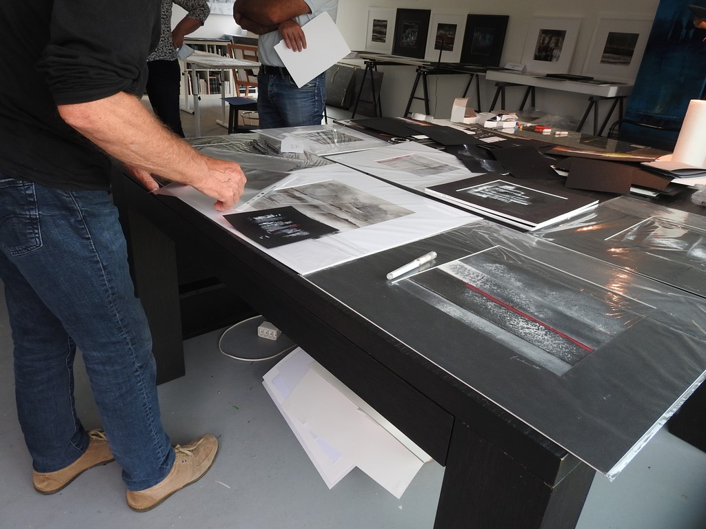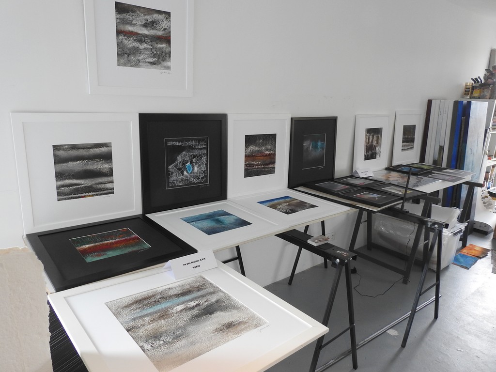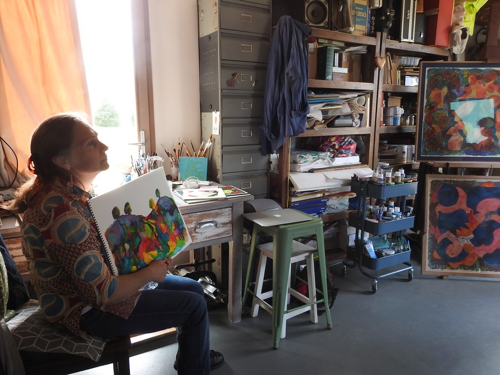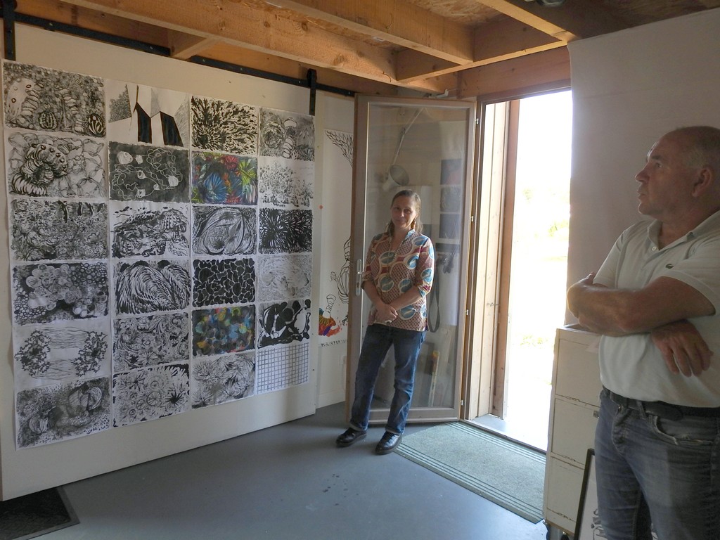 Le premier atelier visité fut celui de AUDREY BASTARD. Déjà en pleine conversation avec un amateur de peinture, Audrey, au regard bleu azur, nous recevait en jeans, blouse et boucles d’oreilles aussi colorées et gaies que ses tableaux. Très peu de figuratif, surtout de l’abstraction, et libre aux visiteurs d’y découvrir des personnages ou des paysages, car la fluidité de l’encre suggère à chacun de s’imaginer une histoire derrière la libre expression d’Audrey. Suivant le grain, plus ou moins fin, ou suivant la texture du support plus ou moins absorbante, son travail est à la fois technique et ludique.
