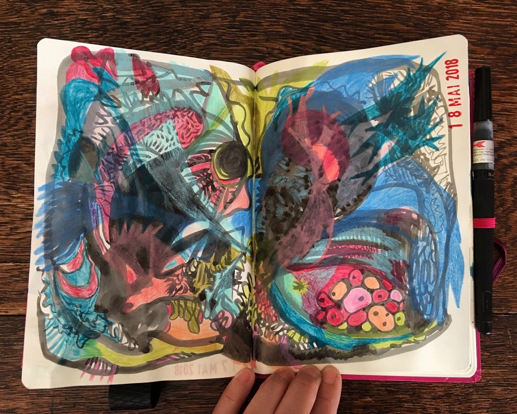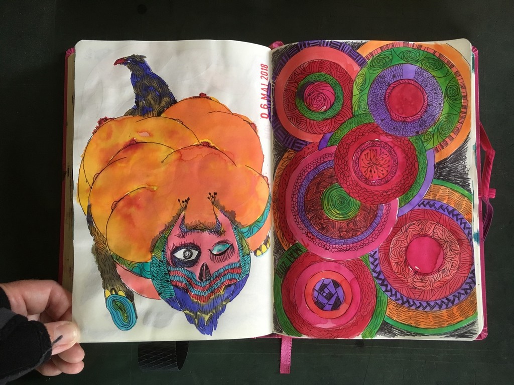 Il en découle une très grande diversité de graphismes, une foisonnante liberté, une énergie follement colorée et un goût certain pour les encres de toutes sortes avec lesquelles elle peint et joue aujourd’hui. Quelles que soient les épreuves, Audrey cherche à les sublimer au travers de sa peinture.