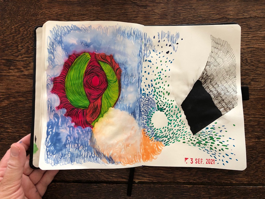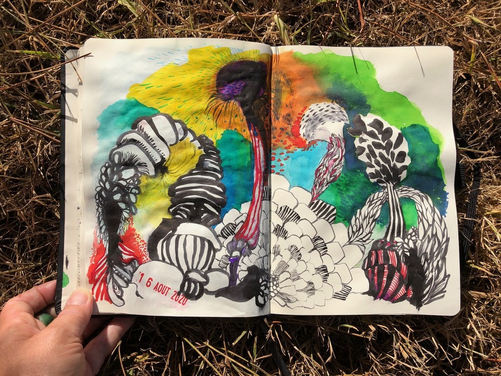 S’ensuit un travail en noir et blanc où l’encre de Chine intensifie les contrastes et les gestes du dessin au pinceau, puis un travail d’expressions et techniques libres dans un journal de bord.