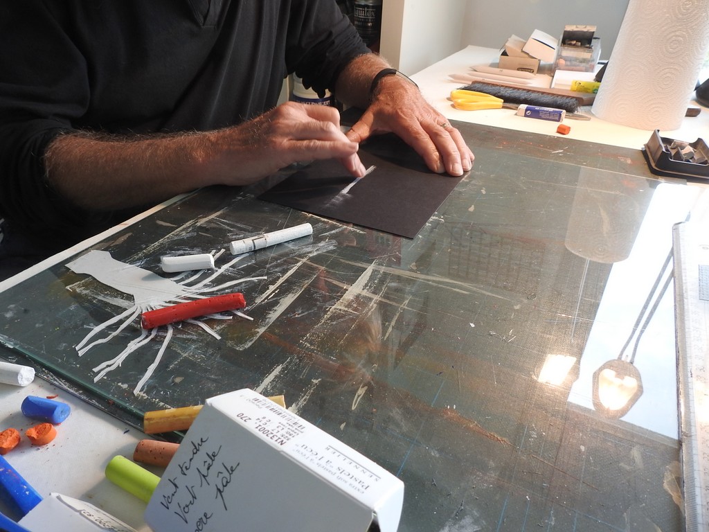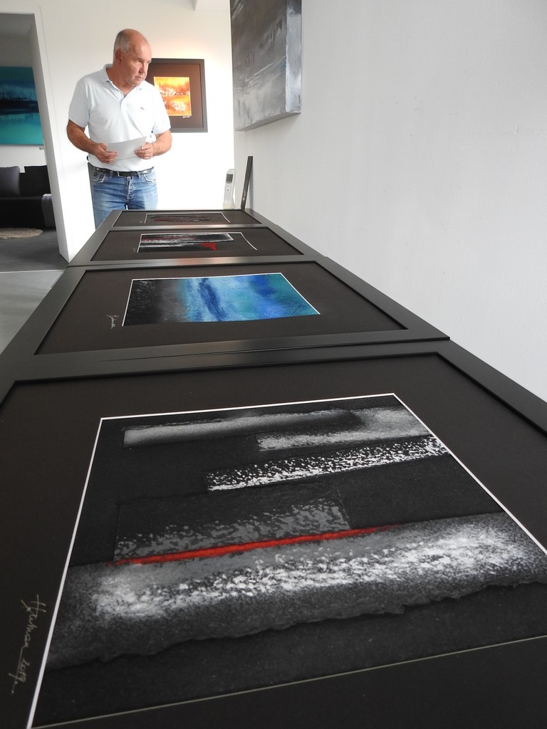 Dans cet univers cubique, nous empruntons un escalier rond en colimaçon pour parvenir à ce qui est véritablement l’atelier de l’artiste. Atelier où de grandes baies vitrées font jouer la lumière sur de nombreuses œuvres exposées aux murs et sur des tables. Des peintures acryliques et des pastels. Tout en discutant à bâton rompu, Manu Henrion propose une démonstration de pastel. Sur un petit papier carré au grain prononcé provenant des papeteries du Moulin de Larroque en Dordogne, la main est sûre et le geste précis. D’autant plus que ce travail, qu’il va offrir à Madame Gardeau, raconte, avec tout l’humour qui le caractérise, leur première rencontre dans le village. Contact mouvementé pour ne pas dire houleux au sujet d’une place de parking ! Histoire retranscrite au pastel qu’elle ne pourra pas oublier !