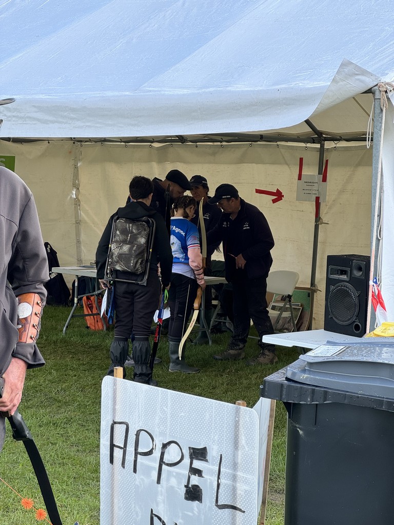 « Samedi matin 18 mai, Victoire arrivait sur site à 8h45 pour un passage au contrôle du matériel (vérification par les arbitres de l’arc, des flèches, du gant et des fiches de marque), puis échauffement sur le pas de tir. Ensuite, 10h00, appel de son peloton, et départ en navette vers le parcours où nous ne pouvions pas la suivre.
