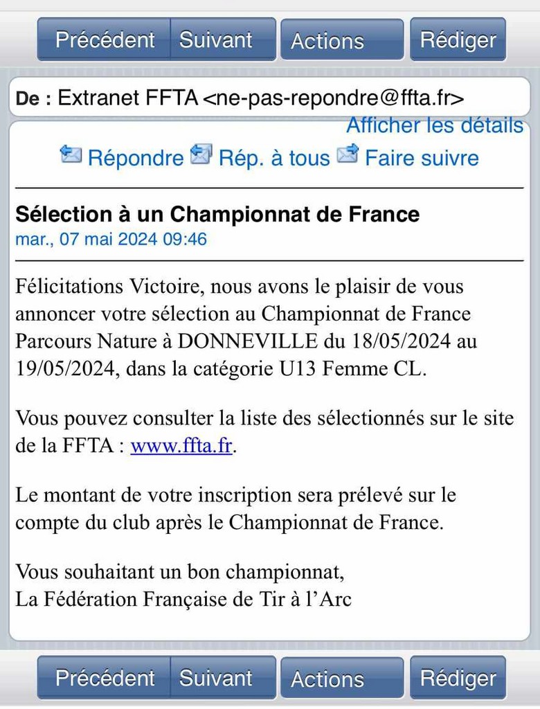 • Victoire, sélectionnée au Championnat de France de tir à l’arc