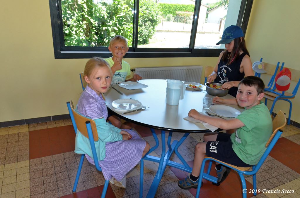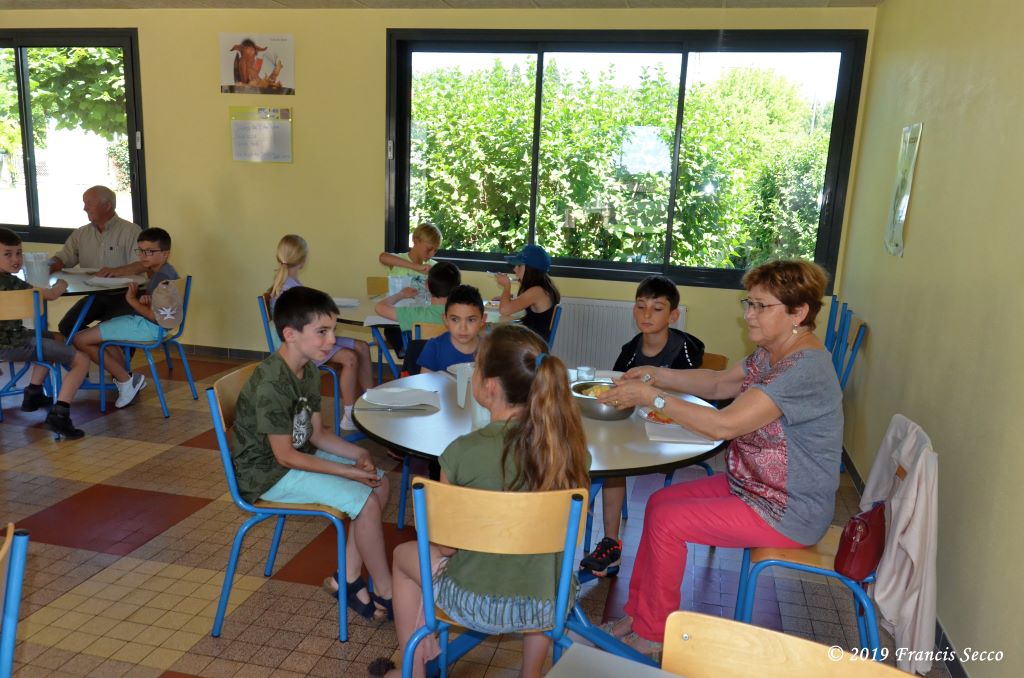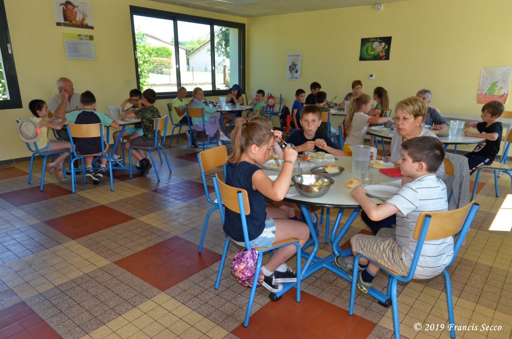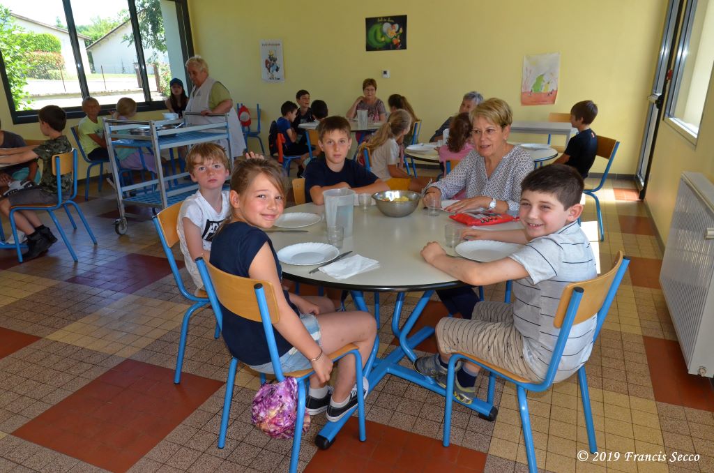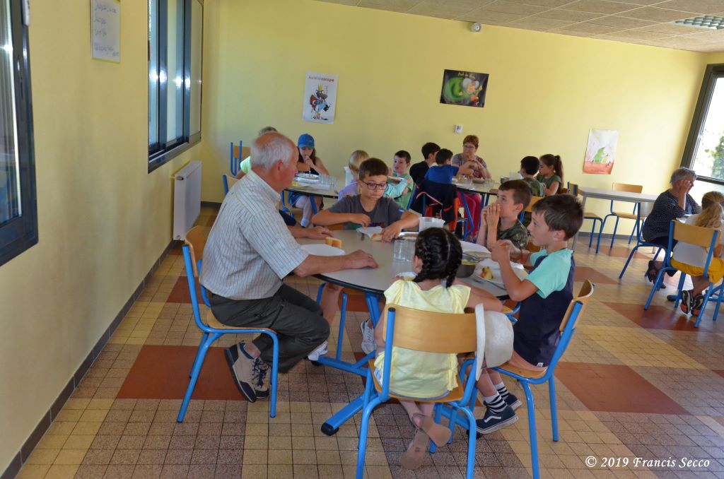 Après un bilan jugé très positif sur les cantines intergénérationnelles de part et d’autre, le groupe se dirigeait en marchant vers l’école. Une façon tout à fait conviviale de découvrir le village et son patrimoine. Devant le portail attendaient sagement 5 seniors, des sauvetatois habitués des lieux qui prirent place chacun à une table d’enfants tandis que les officiels du jour, après avoir salué leurs aînés, s’installaient à une table tout spécialement préparée pour eux. Avant le service des plats, tous étaient déjà en grande discussion.