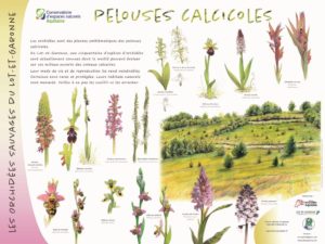 « Les orchidées sont des plantes emblématiques des pelouses calcicoles. En Lot-et-Garonne, une cinquantaine d’espèces d’orchidées sont actuellement connues dont la moitié peuvent évoluer sur ces milieux ouverts des coteaux calcaires.  Leur mode de vie et de reproduction les rend vulnérables. Certaines sont rares et protégées. Leurs habitats naturels sont menacés. Veillez à ne pas les cueillir ni les arracher. »