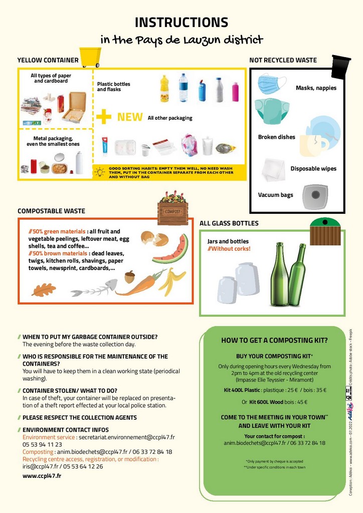 During the first quarter of 2022, investigators certified by the Communauté de Communes du Pays de Lauzun will meet you at home to inform you of the new waste management procedures and establish your bin needs. Thank you for giving them the best welcome!