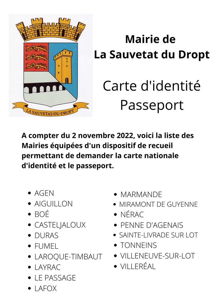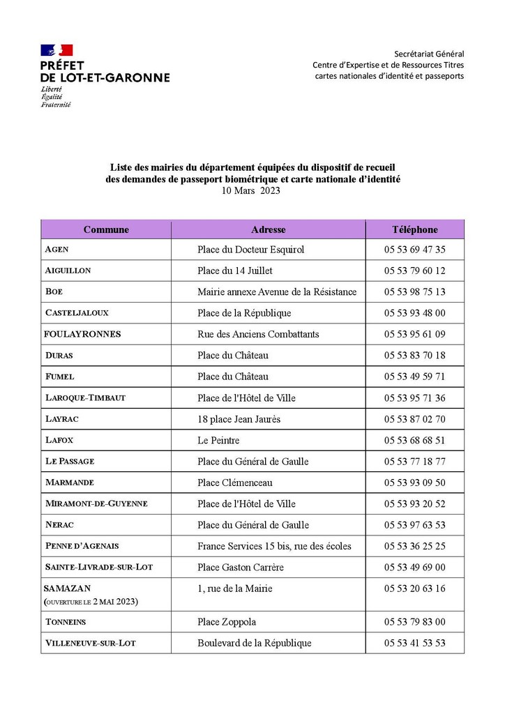 La Préfecture du Lot-et-Garonne vous adresse le nouvel arrête publié le 3 mars 2023 fixant la liste des communes du Lot-et-Garonne équipées de dispositifs de recueil ainsi que la liste avec les adresses des communes équipées de ces dispositifs de recueil.