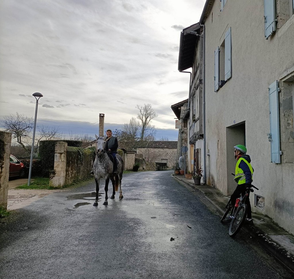 Le passant qui déambulait par temps humide dans la Rue de l’Hospice en compagnie d’un jeune cycliste a eu le plaisir de croiser Jean-Pierre sur sa haute monture. Une sympathique rencontre qui arrivait du Pont Roman depuis la commune d’Agnac.