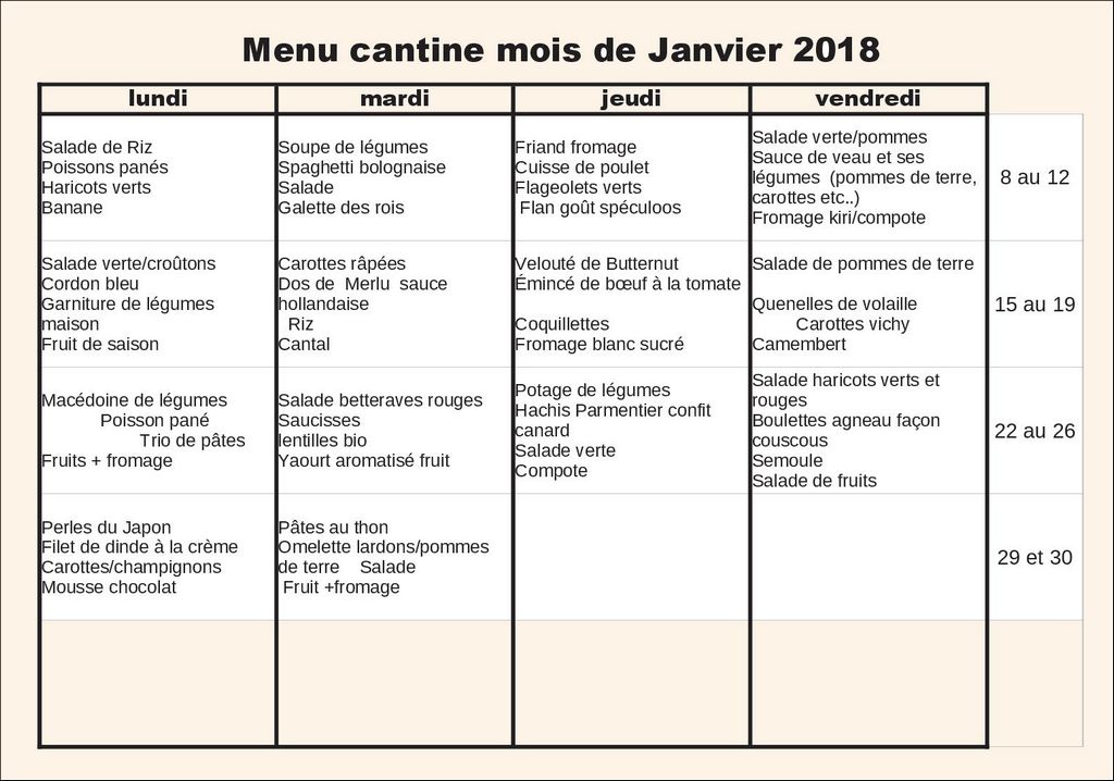 Ci-contre, à partir du 15 janvier, vos menus concoctés par Hélène pour vous permettre de choisir les jours de repas à la cantine. N’oubliez pas de vous inscrire à la mairie 1 semaine avant.