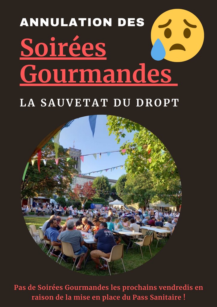 En raison de la mise en place du Pass Sanitaire instauré par le gouvernement depuis le lundi 9 août, le bureau du Comité des Fêtes a décidé d’annuler les prochaines dates de Soirées Gourmandes prévues les vendredis 13, 20 et 27 août ainsi que le vendredi 3 septembre qui devait être musicalement animé par un groupe du choix de Staccato.
