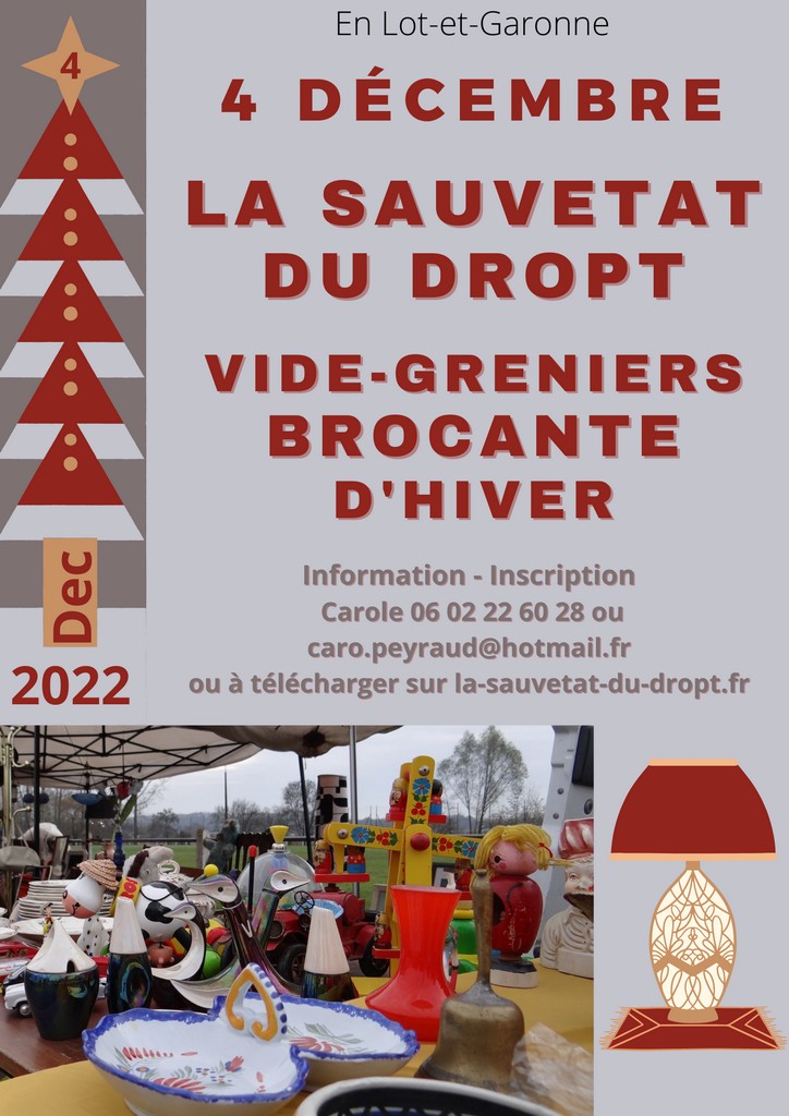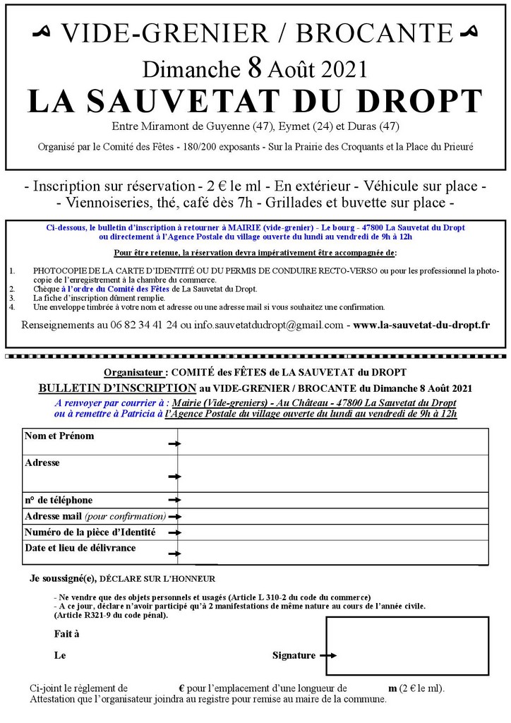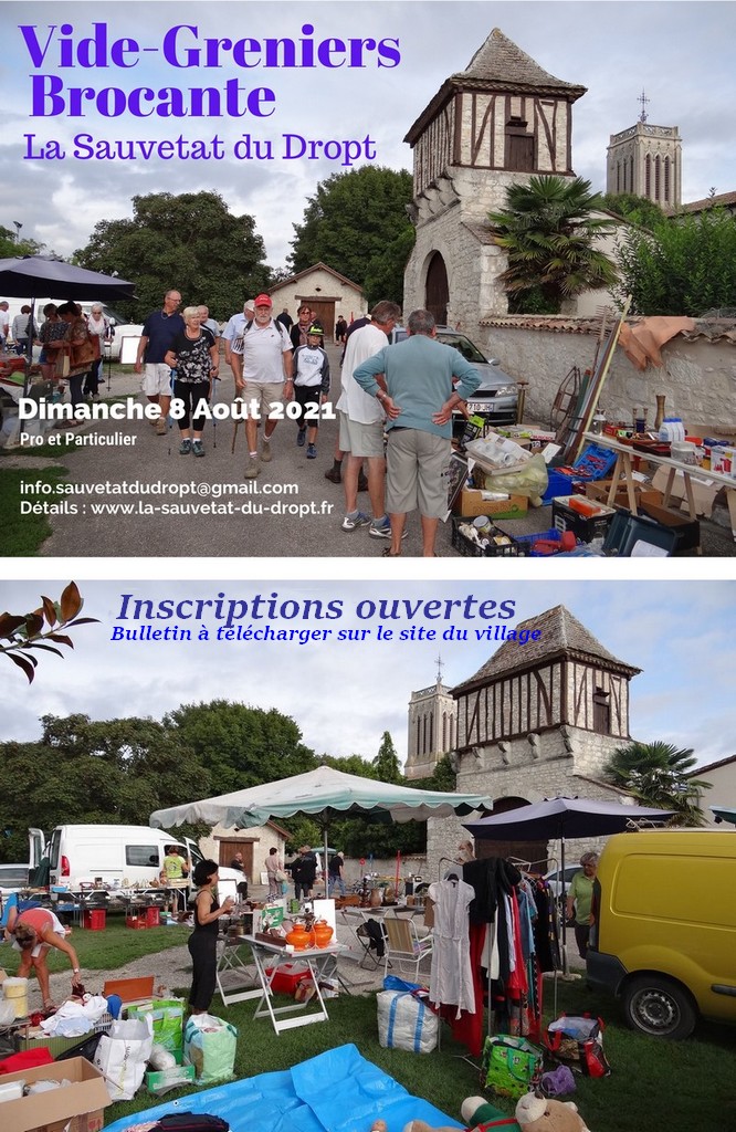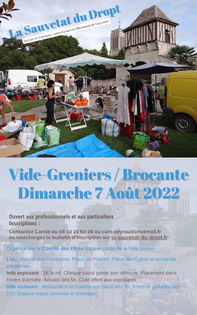 Grand Vide-greniers / Brocante qui aura lieu sur la Prairie des Croquants, la Place du Prieuré, à l’arrière de l’église et dans la prairie au bord du Dropt. Les stands sont placés dans l’ordre d’arrivée. L’accueil se fait dès 5h le matin. Le café est offert aux exposants.