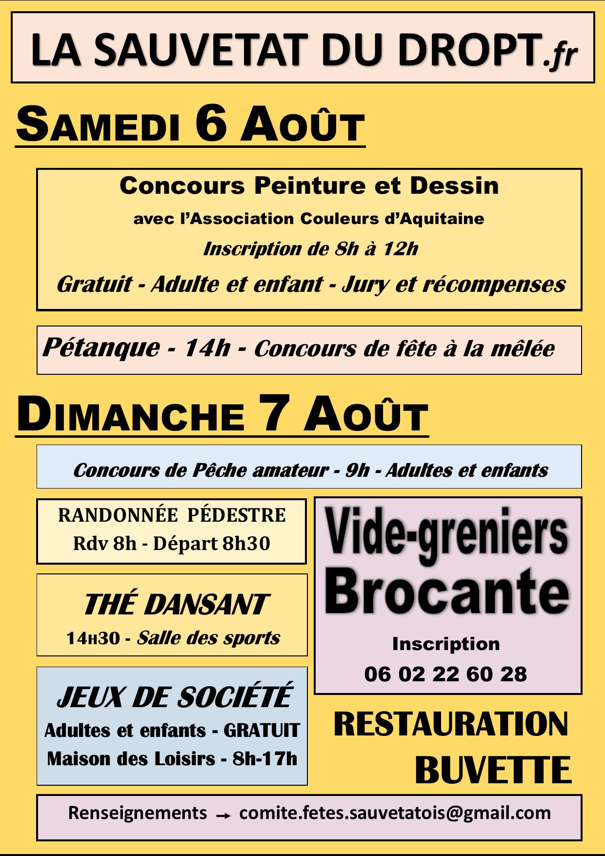 La journée débute dès 8h et jusqu’à midi par les inscriptions au Concours des Peintres ou Dessinateurs dans la rue organisé par l’Association Couleurs d’Aquitaine reçue par les Amis de la Sauveté. Ouvert aux adultes comme aux jeunes et enfants, que vous soyez professionnels ou amateurs. Pour en savoir plus : 07.85.93.93.05 ou associationcouleursdaquitaine@gmail.com