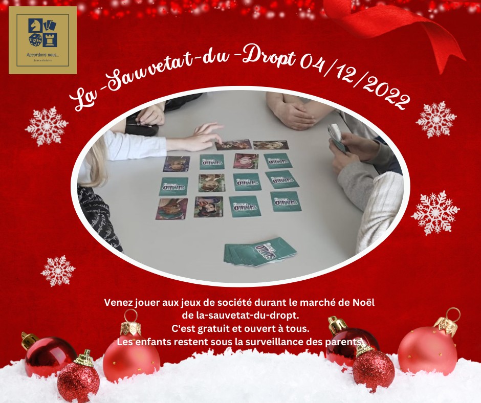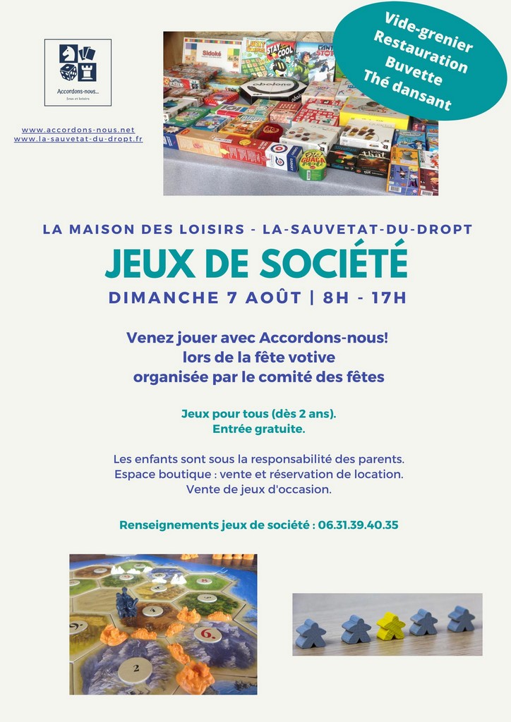 Jeux de Société avec les pros du jeu de société Stéphanie et Hugues de la boutique sauvetatoise Accordons-nous ! Ils vous accueilleront de 8h à 17h dans la Maison des Loisirs, salle du Point Lecture. Renseignements au 06 31 39 40 35 ou accordons-nous@outlook.fr
