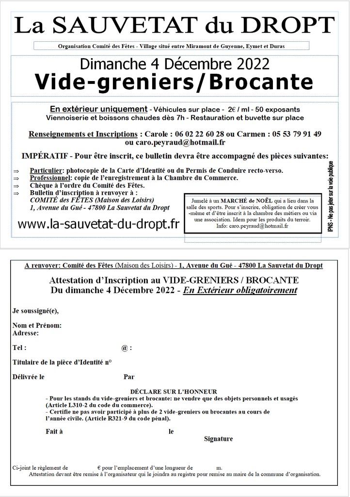 Le bulletin d’inscription à télécharger Inscription VG-B La Sauvetat du Dropt. Respecter les modalités de participation. Pour toutes informations complémentaires, n’hésitez pas à joindre Carole dont les coordonnées sont affichées sur les documents ci-après.