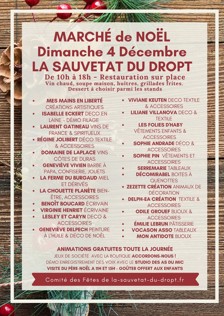 De nombreux stands, un menu d’hiver concocté par les bénévoles du Comité des Fêtes et les Amis de la Sauveté, un Père-Noël généreux qui viendra faire une virée vers 11h et une seconde vers 15h avant d’emmener les enfants pour un goûter offert par l’association, des animations originales et gratuites avec la boutique de jeux de société sauvetatoise Accordons-nous et la découverte des secrets d’un studio d’enregistrement avec Jarh et Royal Rimeur du Home Studio ADM, lui aussi basé à l’entrée de la commune.