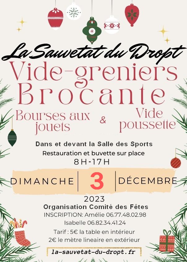 • Le Vide-greniers / Brocante se tiendra uniquement à l’extérieur. Devant et autour de la salle des sports. Pour vous renseigner, appelez Carole au 06 02 22 60 28.
