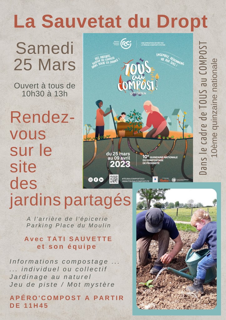 Pour la 10 -ème édition de Tous au Compost – évènement national sur le compostage de proximité qui aura lieu du 25 mars au 9 avril – l’équipe municipale de Tati Sauvette organise à nouveau un moment de rencontre avec la population sauvetatoise pour échanger sur ce sujet d’actualité.