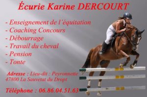 L’écurie de Karine Dercourt est située au lieu-dit Peyronnette à La Sauvetat du Dropt et vous propose différentes prestations de qualité pour vous et votre cheval: enseignement à domicile ou aux écuries, travail du cheval, débourrage, pension, tonte, passage de galop, gardiennage …
