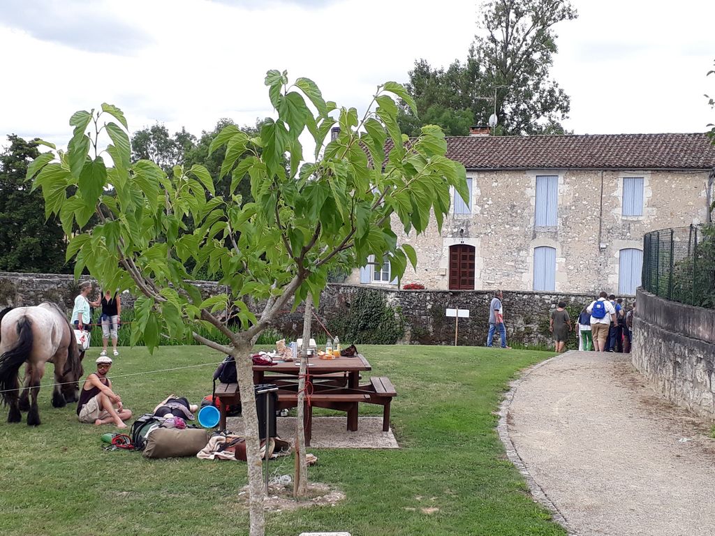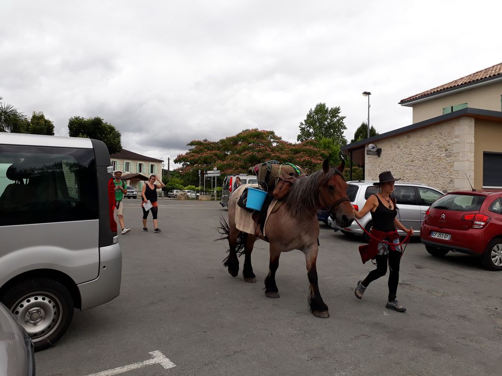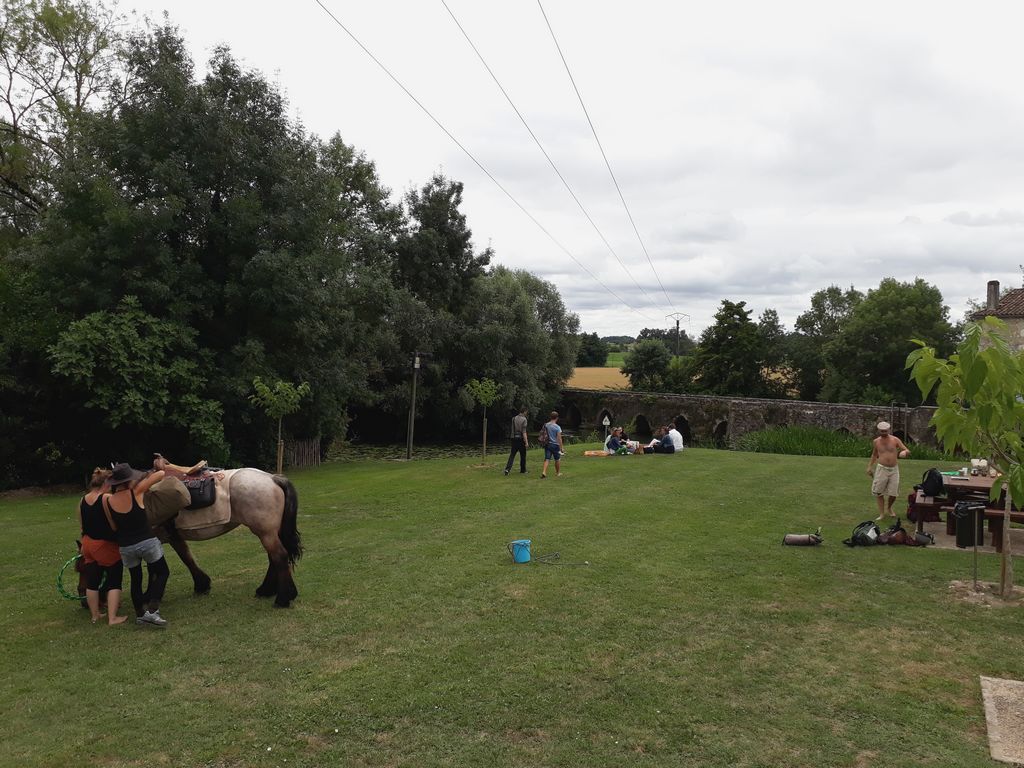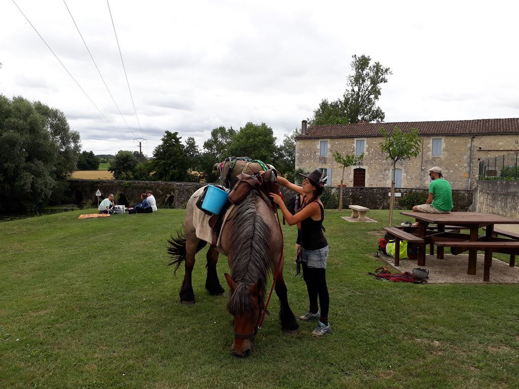 C’est avant et pendant le casse-croûte que nous avons eu la chance de rencontrer des gens de passage. Un premier groupe composé d’un cheval de trait accompagné de jeunes gens venant de Grignols (33) en direction d’Avignon (84). Comme nous, ils se sont installés pour partager leur repas champêtre.