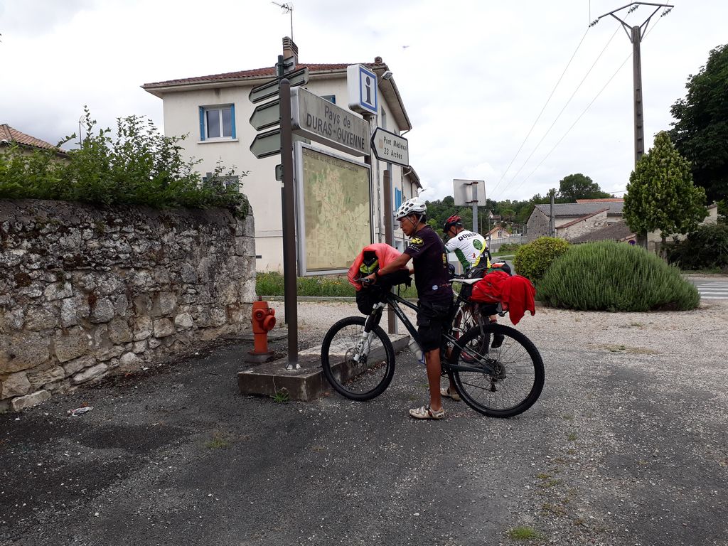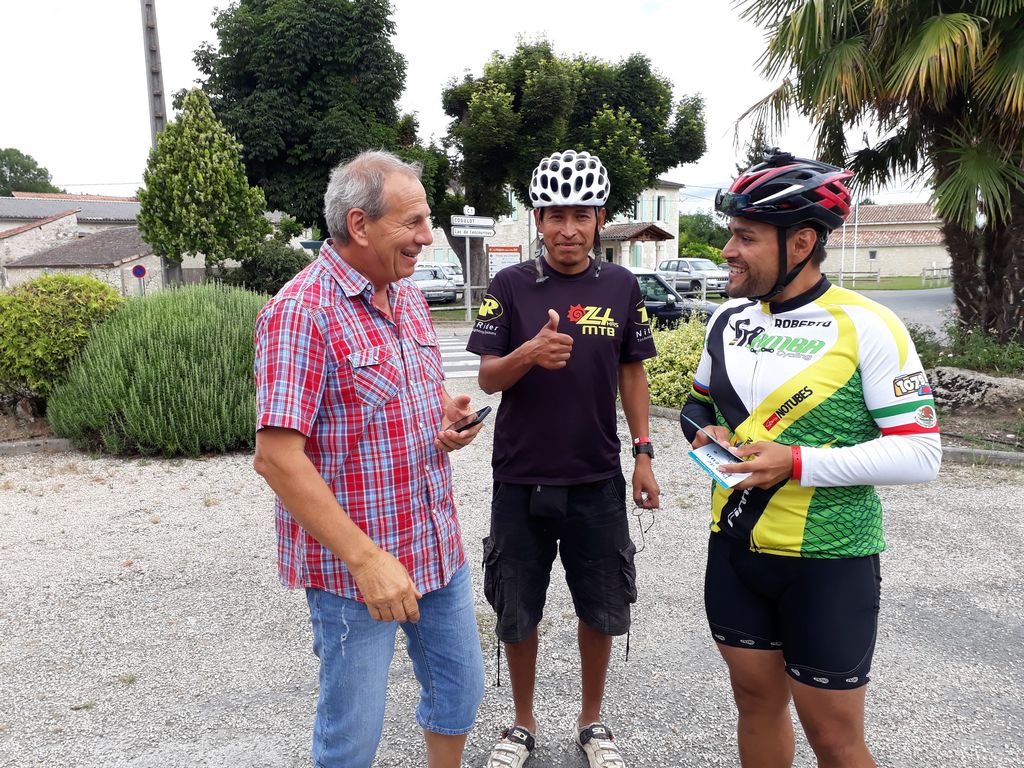 Puis, une autre belle rencontre. Deux jeunes touristes sur leur vélo en tenue de cyclistes colorées. Interrogés en espagnol par Germain Sauron, 1er adjoint de la commune, nous apprenions qu’ils étaient de nationalité mexicaine et qu’ils arrivaient d’Eymet où ils avaient assisté au départ du Tour de France de la veille. Leur périple devait les conduire jusqu’à Bordeaux, puis à Paris et enfin à Londres! Cette brève rencontre nous aura permis de vérifier la notoriété internationale de cet événement.