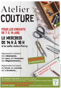 A compter du mercredi 10 janvier 2018 et tous les mercredis, l’Amicale Laïque organise un atelier couture pour les enfants âgés de 7 à 14 ans avec Sylvie Gay au local Jules Ferry à Miramont de Guyenne de 14h à 16h.