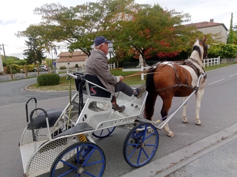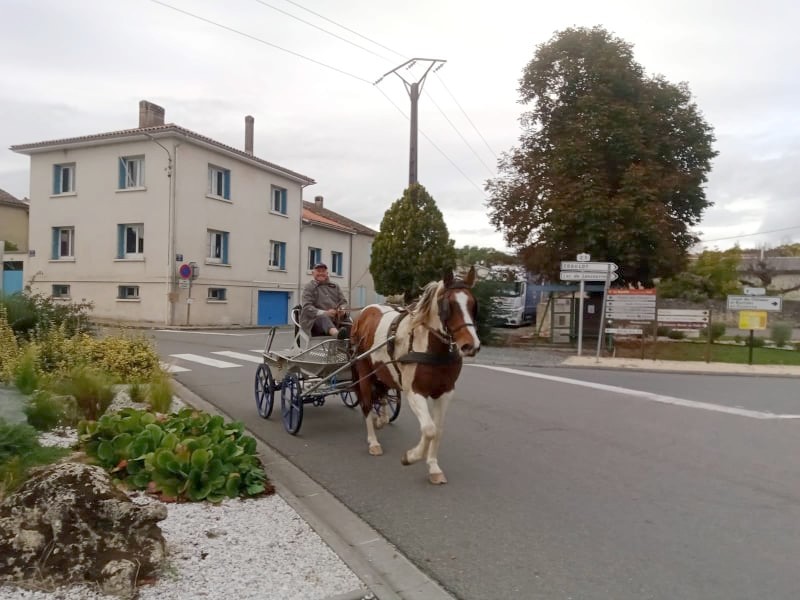 Le passant du jour se trouvait être le 1er adjoint de la commune, Germain Sauron. Charmé par l’arrivée d’un attelage inhabituel, il nous envoie ces deux photos pour immortaliser l’instant. Le cocher, Jean-Pierre Ménini, bien connu dans le village et résidant à Agnac, a déjà été sollicité avec une autre de ses carrioles à cheval pour conduire le Père-Noël au cœur du Marché de Noël.