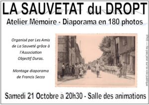 Grâce au club photo Objectif Duras et son responsable Michel Michelot, grâce aux membres de ce club qui ont très patiemment scanné quelques 180 photos triées pour l’occasion et enfin, grâce au sauvetatois et membre du club Francis Secco qui les a réunies dans un diaporama, Les Amis de la Sauveté sont heureux de vous inviter à une soirée de projection qui aura lieu Samedi 21 Octobre à 20h30 dans la salle des animations.