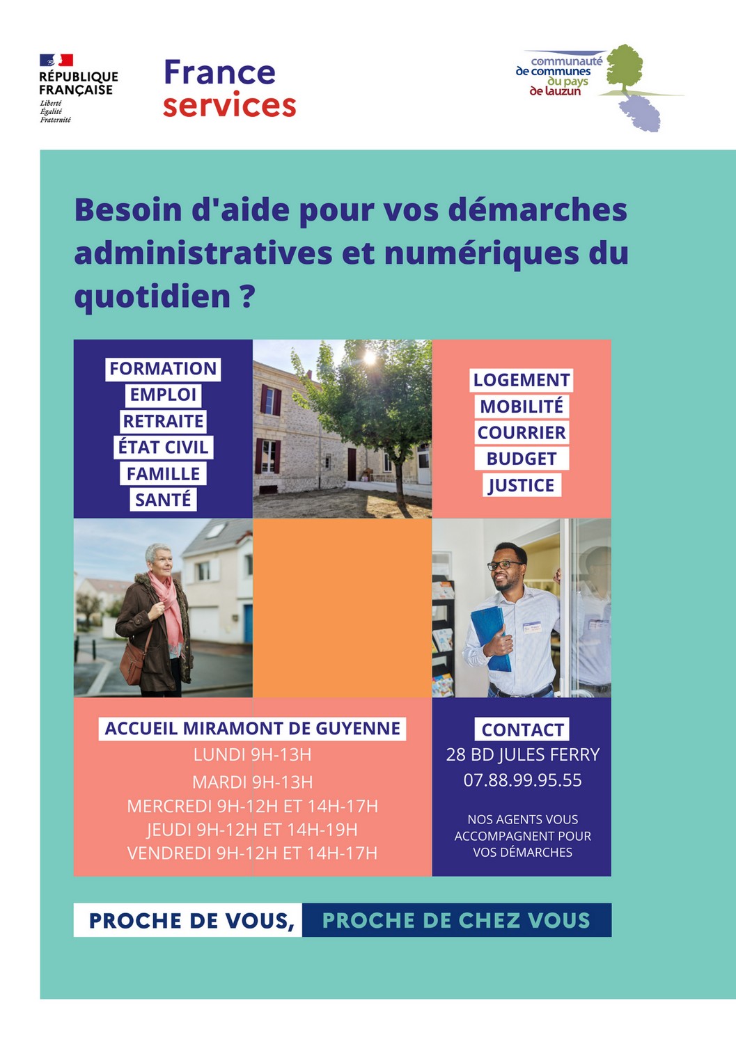 Pour vous aider dans toutes vos démarches administratives, une Maison France Services vient d’ouvrir ses portes à Miramont de Guyenne dans les salles de l’ancienne bibliothèque. Deux agents sont présents pour vous accueillir et vous accompagner.