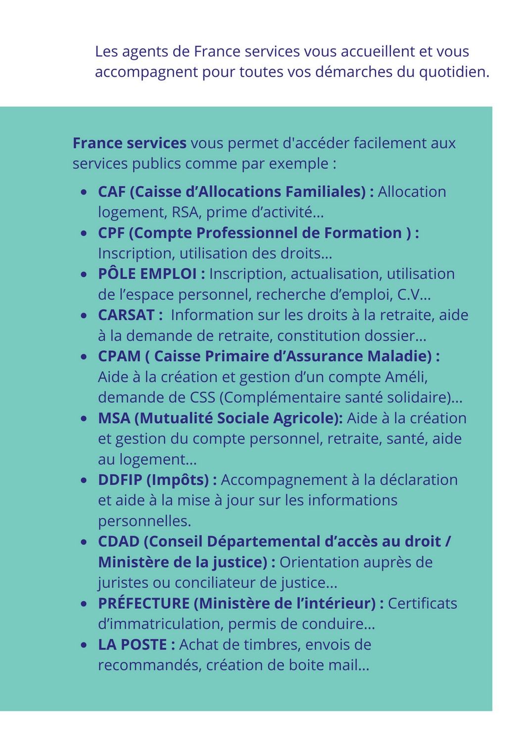 Ci-dessous, sur le document, la liste exhaustive des démarches possibles à France Services, les coordonnées et les horaires d’ouverture.