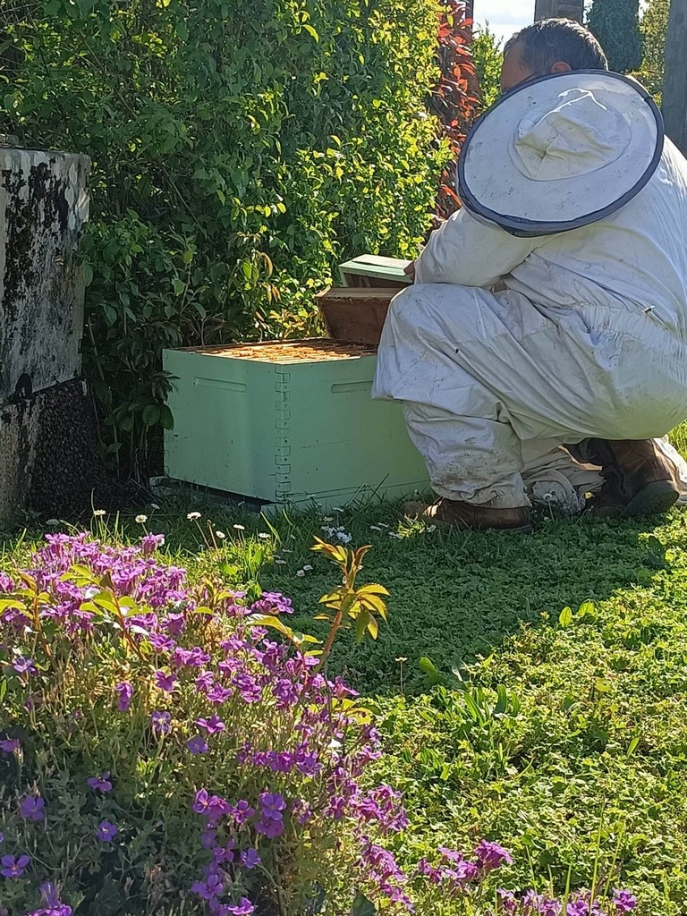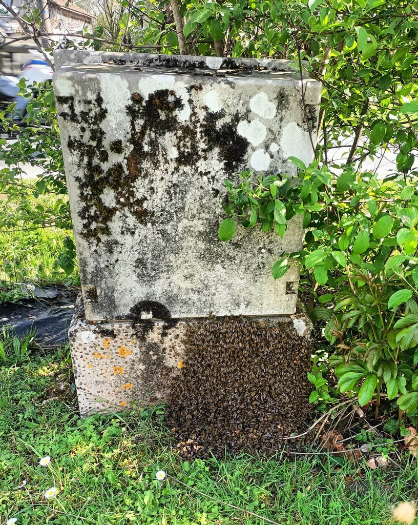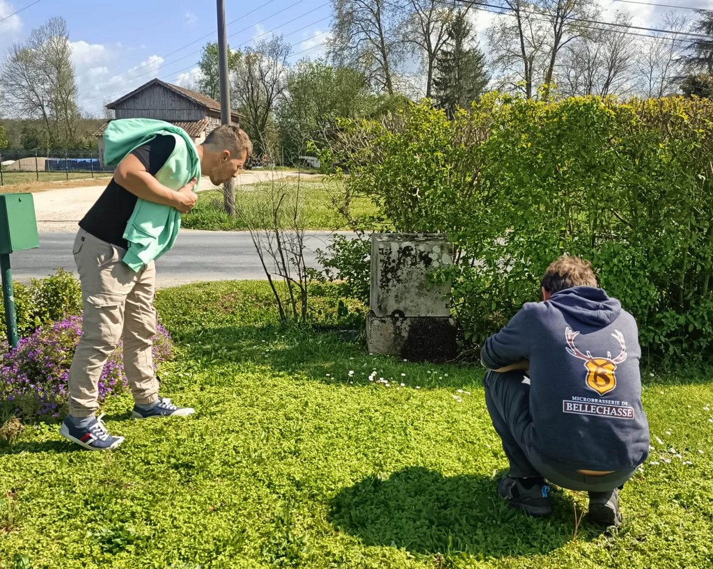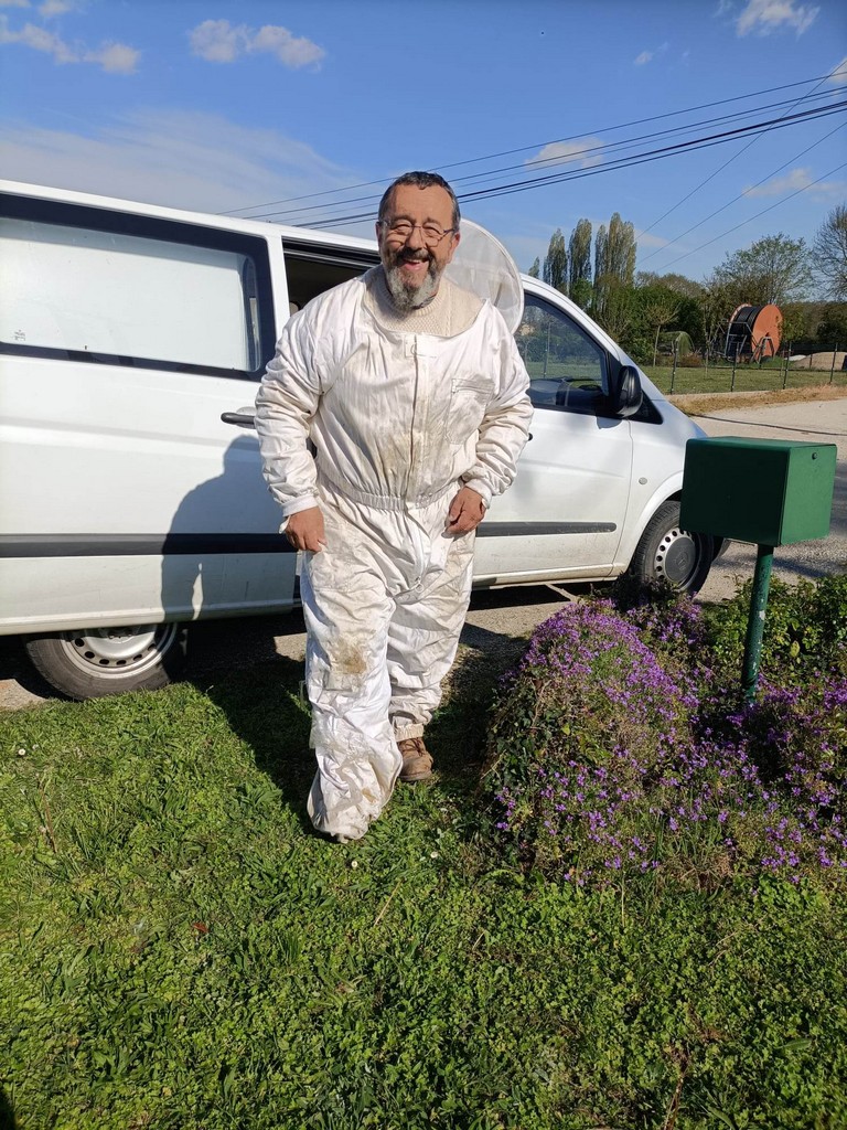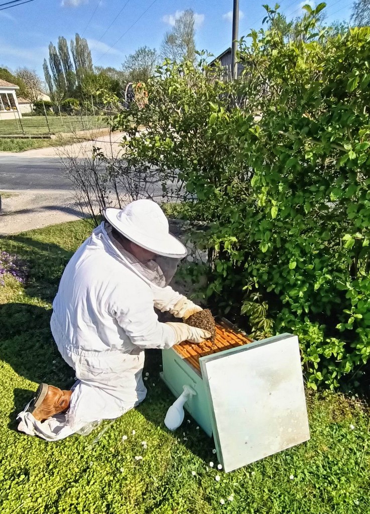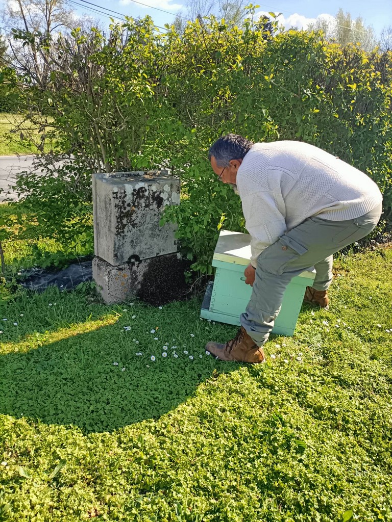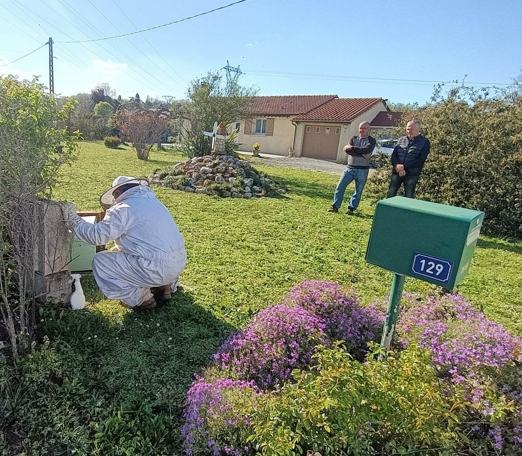 Alors qu’il travaillait dans son jardin, Jean-Marc, ex employé municipal de La Sauvetat du Dropt, était attiré par un agglutinement d’insectes au pied de son boitier électrique. Constatant qu’un essaim d’abeilles cherchait un endroit où se loger, il décidait de faire appel à un apiculteur. Bien que ce ne soit qu’une activité de loisirs, c’est Jean-Luc Carmelli du Domaine de Laplace qui se déplaçait depuis St Jean de Duras avec une ruche et bien sûr, la tenue adéquate pour manipuler la colonie en toute sécurité.