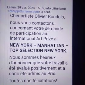 Inscrit sur le site italien Pitturiamo dédié aux artistes connus ou inconnus où il expose, un des tableaux d’Olivier intitulé « 2001 » vient d’être sélectionné pour une participation en ligne à l’International Art Prize New-York Manhattan.