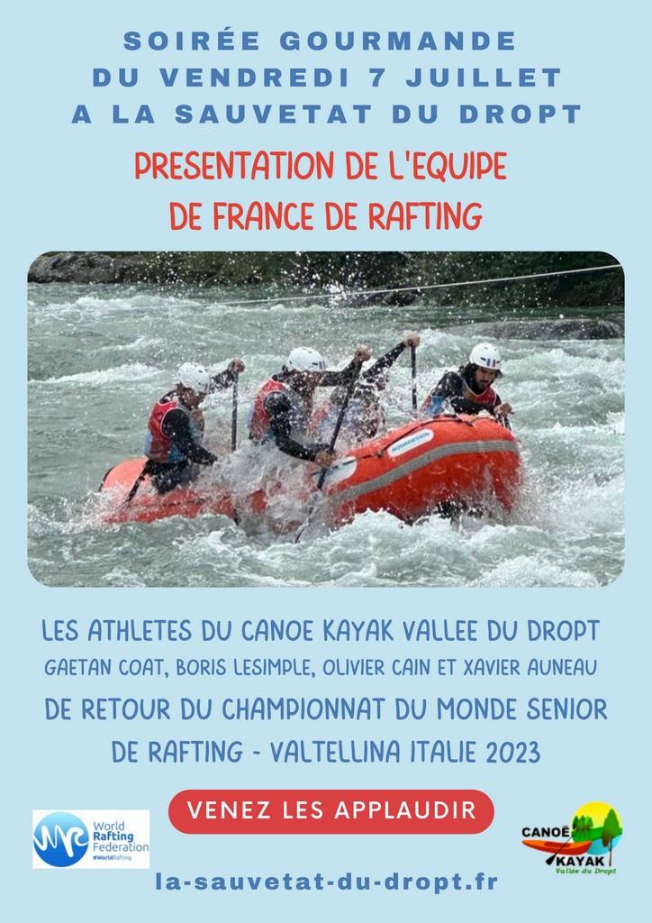 Ils sont rentrés les athlètes de l’Équipe de France Senior qui viennent de participer au Championnat du Monde de Rafting en Italie. Ils se nomment Olivier Cain – actuel président du CKC VDD – Boris Lesimple, Gaétan Coat et Xavier Auneau, tous formés par le Club du Canoë Kayak Vallée du Dropt.