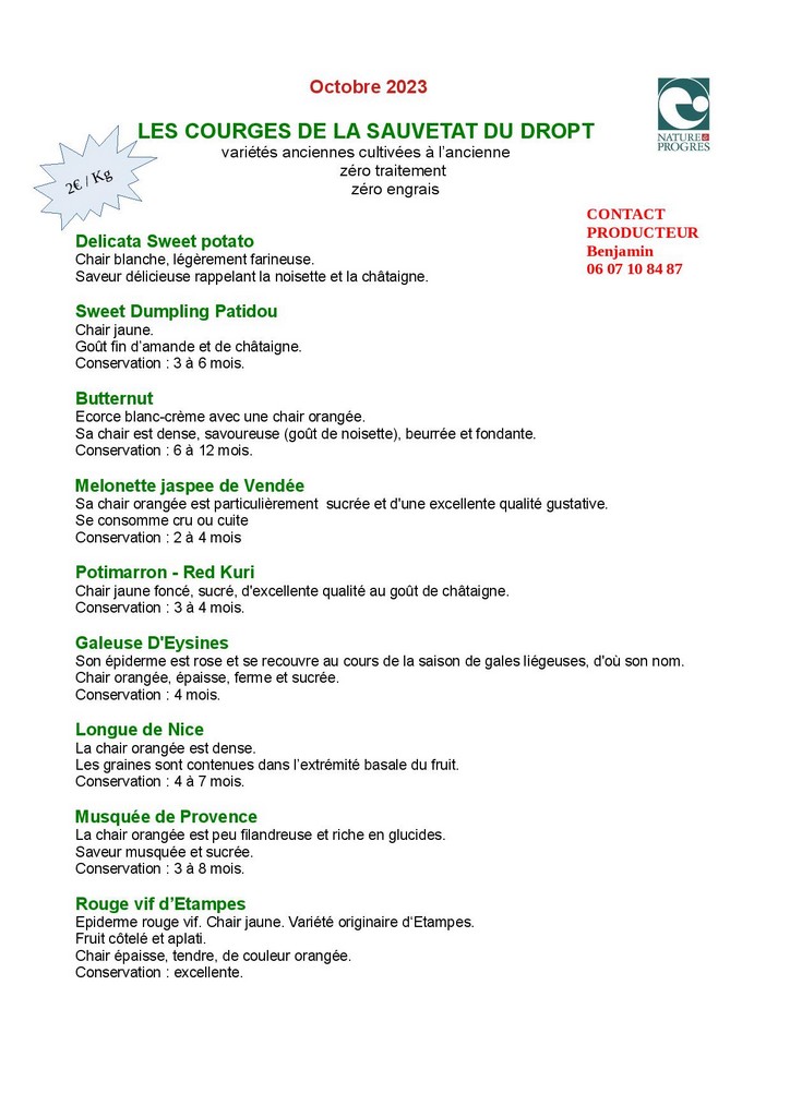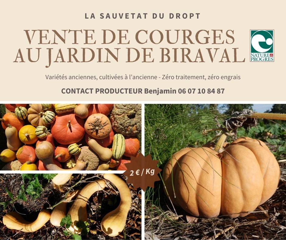 Au Jardin de Biraval à La Sauvetat du Dropt, Benjamin Bergeon vous propose des courges de toutes les formes et de toutes les couleurs à 2 € le kg. Il suffit de choisir dans la longue liste très détaillée suivant la saveur recherchée puis de le contacter et d’aller chercher à la source.