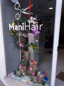 Vive et enjouée, notre jeune coiffeuse du Salon ManiHair situé à La Sauvetat du Dropt a aussi un talent certain pour mettre sa vitrine en valeur. Aidée de son amie Céline, sauvetatoise et décoratrice, c’est sur le thème du printemps que vous serez accueillis ce mois-ci.