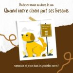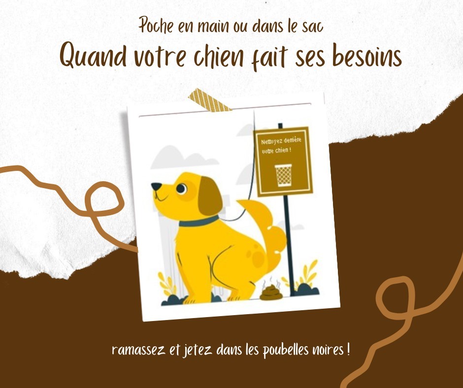 Si votre chien à besoin de faire « popo » alors que vous êtes sur le trottoir, conduisez votre chien dans le caniveau puis ramassez la déjection à l’aide d’un sachet. Nouez le sachet ou repliez sa partie supérieure. Jetez le tout dans une poubelle à disposition sur la voie publique. Faites de même en zone publique (chemins, espaces verts …).